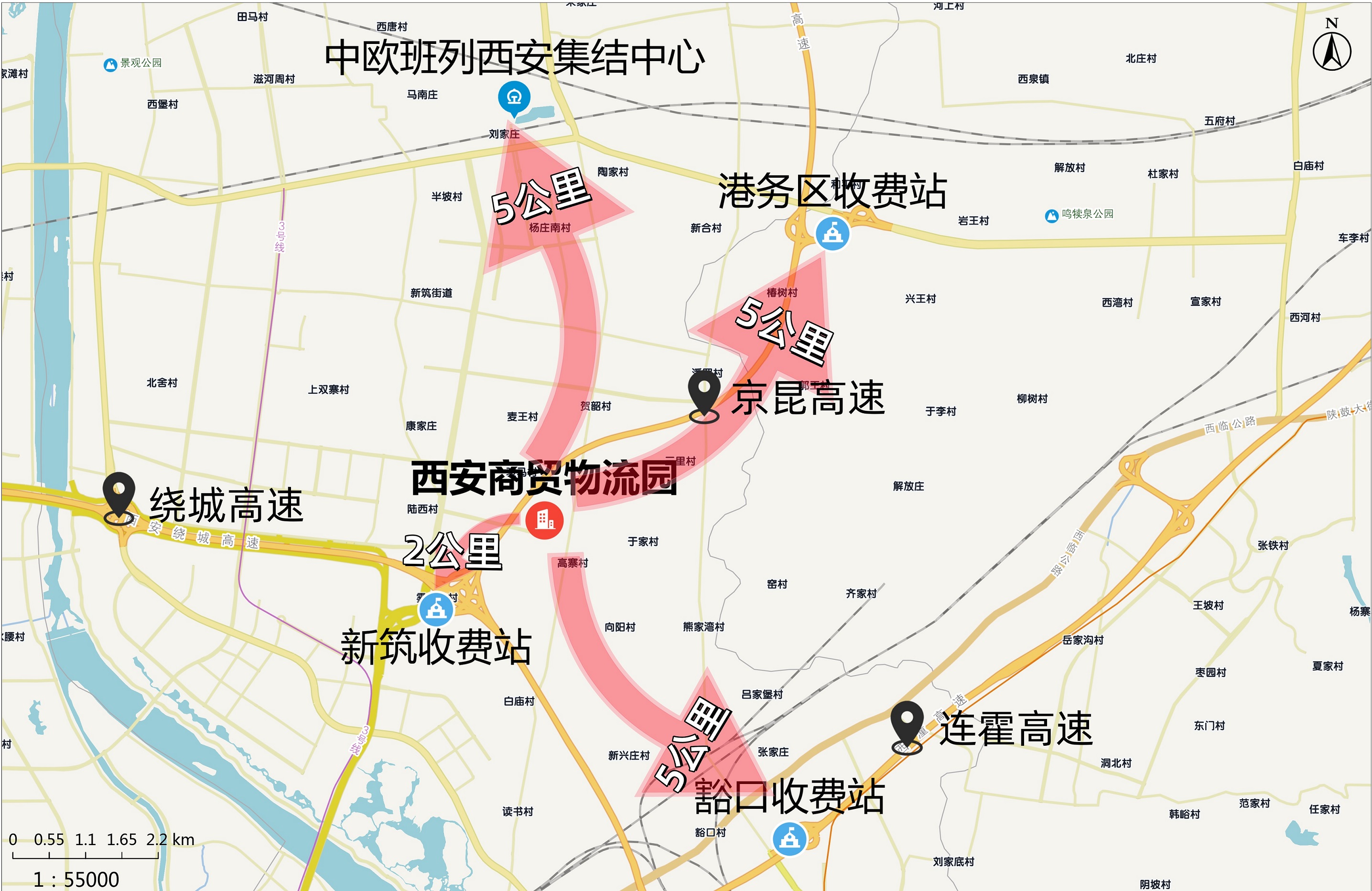 園區(qū)位于浐灞國際港元朔大道與紡渭路交叉口西北角,距繞城高速新筑收費站約2公里,距連霍高速豁口收費站、京昆高速港務(wù)收費站及中歐班列西安集結(jié)中心均約5公里,出行便捷高效。